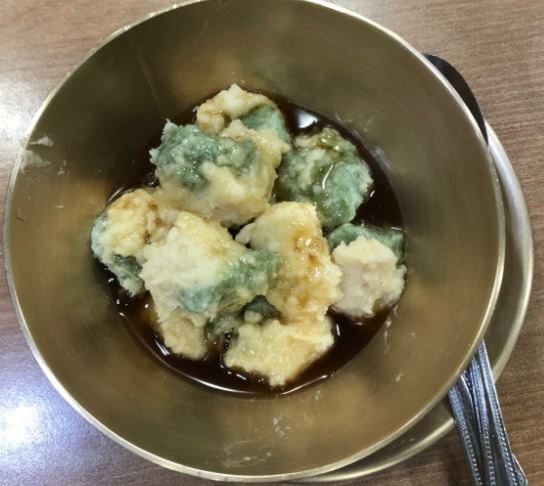 쑥을 버무린 찹쌀가루를 동그랗게 빚어 조청에 담겨져 나온다